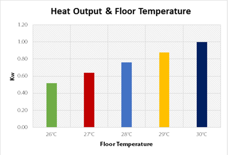 Het is belangrijk om ervoor te zorgen dat de warmteafgifte van de vloer groter is dan het warmteverlies van de kamer. Zoals de onderstaande grafiek illustreert, maakt een verschil van twee graden in de vloertemperatuur een groot verschil in warmteafgifte. Dus als de gekozen vloer alleen kan worden verwarmd tot 27°C, en dit geeft niet de benodigde warmteafgifte kan het nuttig zijn om over te schakelen naar een vloerafwerking die kan worden verwarmd tot 29°C om meer warmte te produceren. Bovendien kan toevoeging van aanvullende verwarming worden overwogen om ervoor te zorgen dat het verwarmingssysteem aan de verwachtingen voldoet.